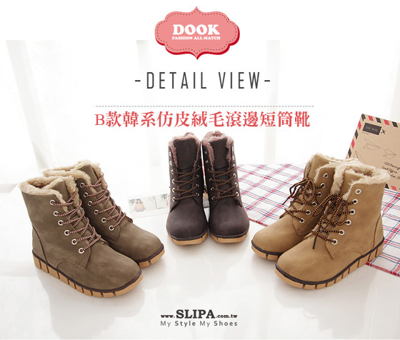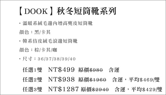 | DOOK-秋冬短筒靴系列-極簡俐落,基本色調,內鋪絨毛滾邊,溫暖舒適。粗曠系街頭短靴,流暢簡約設計風格,妳的原味時尚!平均每雙最低只要429元起(含運)即可購得【DOOK】秋冬短筒靴系列1雙/2雙/3 售價:429 我要購買 |